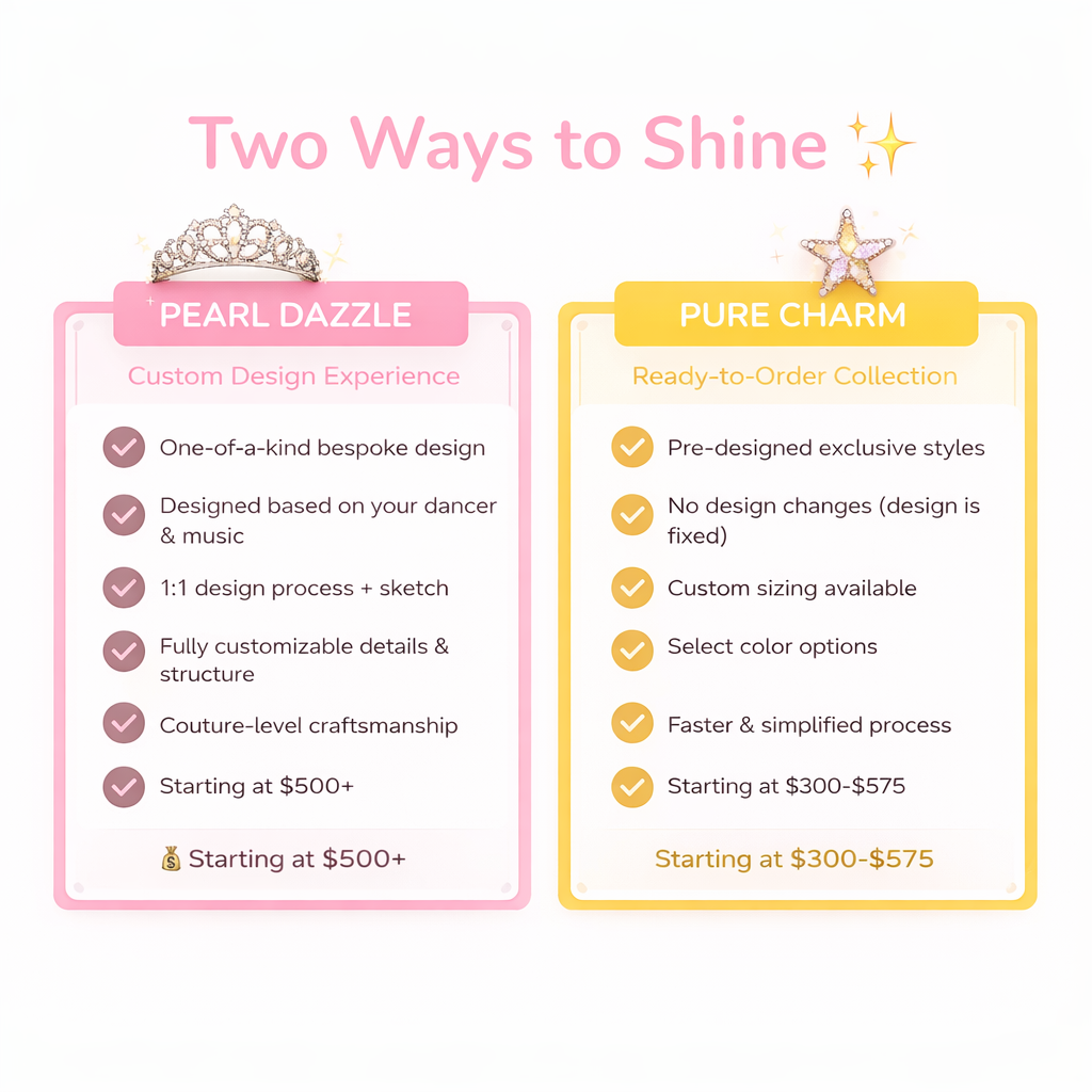 💎 Pearl Dazzle — Fully custom, one-of-a-kind designs tailored to your dancer, music, and vision.